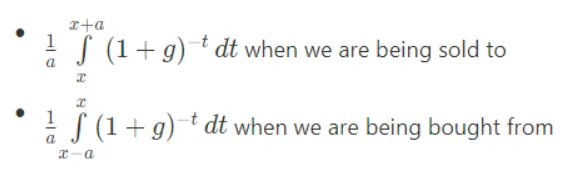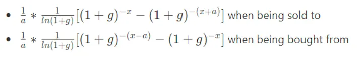 O primeiro passo para encontrar a quantidade ideal de opções para comprar é entender como o preço muda em função da quantidade comprada/vendida. Isso é chamado de derrapagem (slippage), e há uma equação codificada profundamente na lógica do contrato inteligente que determina isso. A derrapagem média em uma determinada exposição inicial x específica, para opções _a _sendo negociadas, é a seguinte: