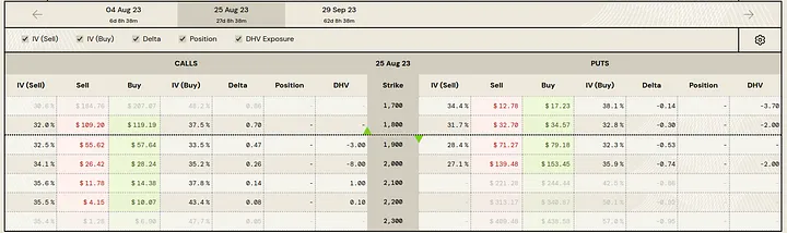 ######Captura de tela do quadro de opções. Você pode ver os preços das opções de compra à esquerda e das opções de venda à direita. Estas são opções de ETH com vencimento em 25 de agosto. Fonte: app.rysk.finance.