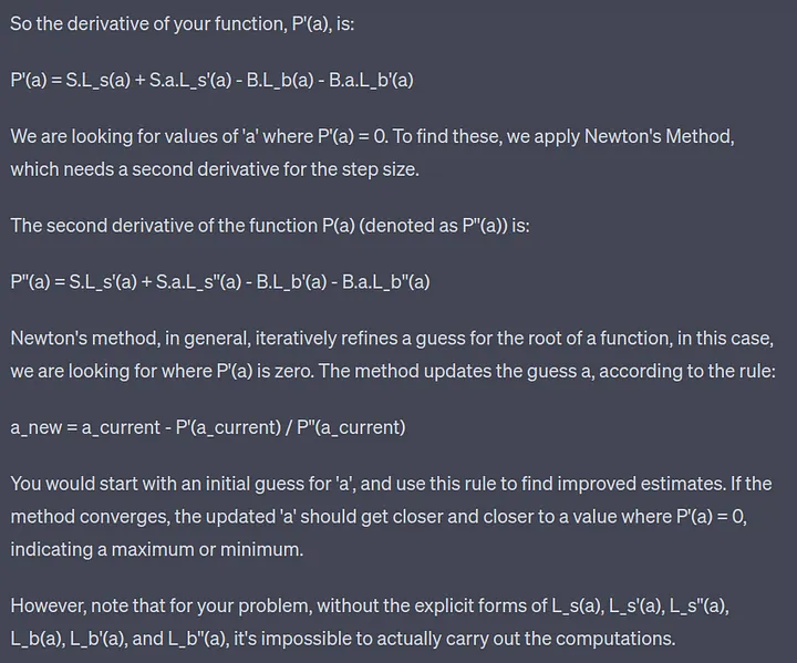 Em nosso caso, f é na verdade P'(a) e "fprime" é P''(a). Não vou entediá-los com todos os detalhes, mas colei todas essas longas equações da saída do WolframAlpha no GPT para traduzi-las em funções JavaScript.