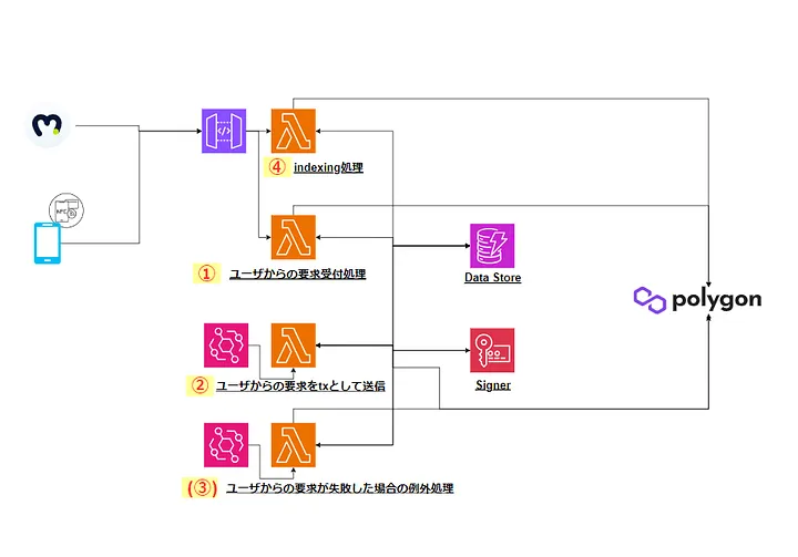 O lado dos Dapps verifica o status da transação. Em termos de implementação, após a confirmação da transação, ele notifica o servidor com as informações necessárias e o número do bloco. O servidor recupera logs deste número de bloco, analisa o evento desejado e os grava no DynamoDB. Isso funciona bem e reduz a carga do servidor, mas não pode indexar transações não enviadas através dos nossos Dapps (por exemplo, NFTs).