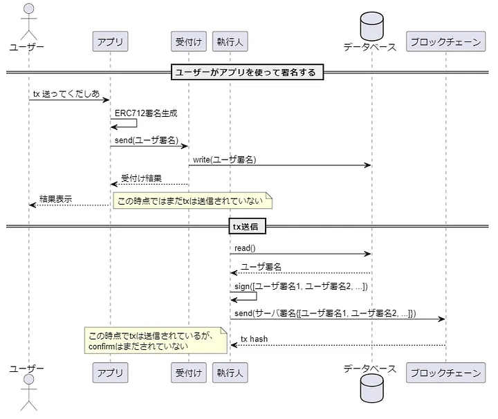 Normalmente, os clientes não conseguem ver as transações que enviaram até que sejam confirmadas. A experiência do usuário pode ser instável dependendo da carga da blockchain e do nó RPC. No produto que estou desenvolvendo, o resultado do processamento do pedido é visível imediatamente após o servidor gravar o registro de recepção, sem esperar pela gravação na blockchain. Isso garante uma experiência do usuário sem depender da velocidade da blockchain ou do nó RPC. No entanto, isso se aplica apenas quando as informações fora da cadeia (como tokenId) podem ser definitivamente derivadas do pedido do usuário.
