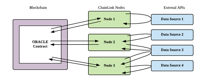 Vários nós participam para evitar a centralização da tomada de decisões. Os dados fornecidos pelos nós são agregados por um Contrato Inteligente (Chainlink-SC) usando métodos apropriados, como média/mediana, etc.