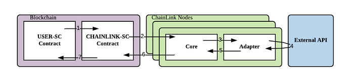 - O contrato inteligente do usuário (USER-SC) envia uma solicitação para o contrato do oráculo (CHAINLINK-SC). Este é o contrato no qual os nós do oráculo (Core) monitoram de perto.