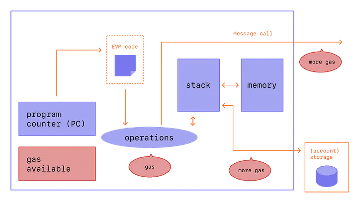 O diagrama a seguir ilustra o layout da Máquina Virtual Ethereum. Nele, podemos ver que o consumo de gás é dividido em três partes: execução de operações, chamadas de mensagem externa e leitura e escrita na memória e armazenamento.