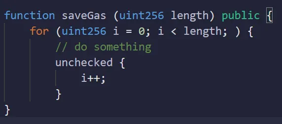 No exemplo abaixo, a variável i nunca pode ter um overflow devido à restrição condicional i < length. Aqui, length é definido como uint256, o que significa que o valor máximo que i pode atingir é max(uint) - 1. Portanto, incrementar i dentro de um bloco não verificado é considerado seguro e mais eficiente em termos de gás.