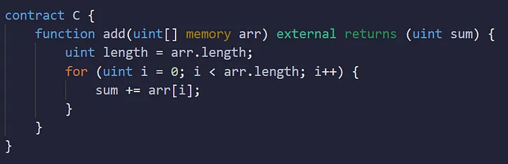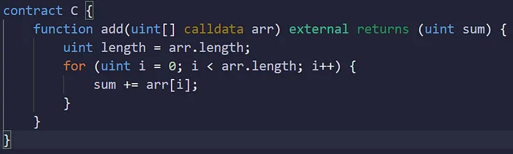 Aqui, o princípio é usar calldata em vez de memory se o argumento da função for somente leitura. Isso evita cópias desnecessárias de calldata para memory na função.