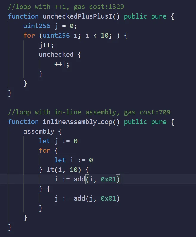 O seguinte é um exemplo de código para economizar gás com o In-Line Assembly: