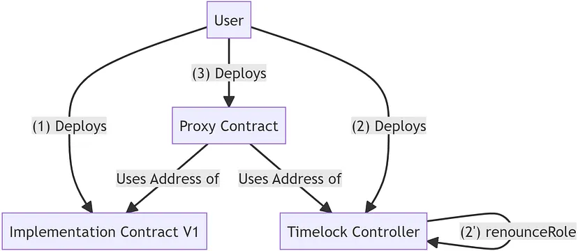 É importante observar a ordem em que implantamos o contrato. Precisamos implantar tanto a implementação do contrato quanto o TimelockController antes de implantar o contrato Proxy. Isso é necessário, uma vez que os dois argumentos do contrato proxy são os endereços de implantação. Aqui está um diagrama representando a ordem.