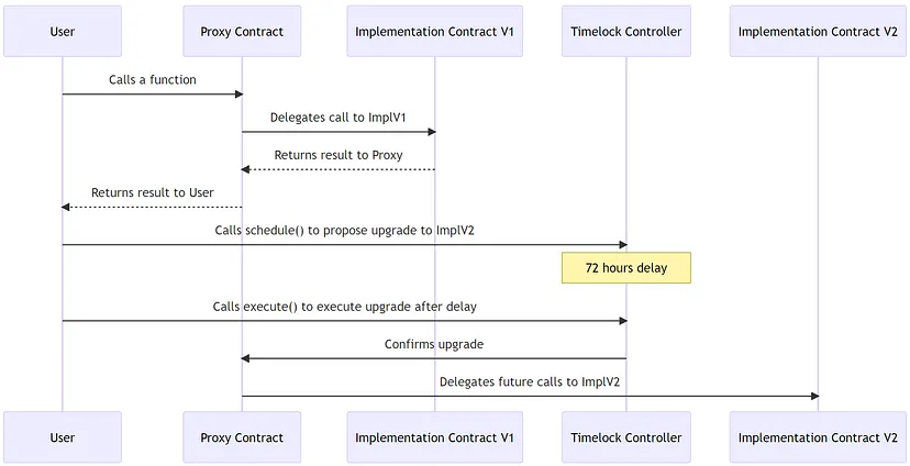 Para tornar este contrato atualizável, usaremos o padrão de Proxy juntamente com as bibliotecas TransparentUpgradeableProxy, Initializable e TimelockController do OpenZeppelin. O novo contrato será controlado por um único administrador que pode iniciar atualizações que entram em vigor após um intervalo mínimo de 72 horas.