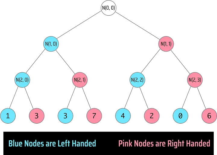Usando nossa definição de nó, também podemos dizer que todo nó N(nível, índice) tem dois filhos N(nível+1, índice*2) e N(nível+1, índice*2+1). Isso é para refletir que cada nível tem o dobro de nós do nível acima dele.