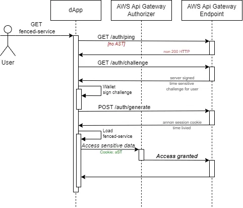 Tendo todos esses pontos de extremidade disponíveis, se quisermos proteger uma determinada funcionalidade do dApp, primeiro faremos uma consulta no ponto de extremidade de ping para ver se o usuário é um detentor de aST válido. Se não houver tal token disponível, iniciamos um subfluxo de criação de desafio aST, caso contrário, apenas carregamos o serviço protegido e continuamos a execução normalmente.
