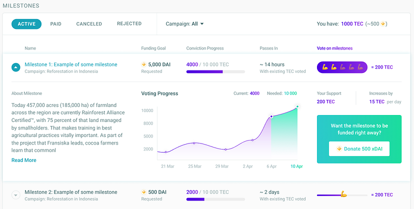 O componente de voto por convicção fica entre a Curva de ligação aumentada, onde os tokens de voto são adquiridos, e o Giveth Proposal Engine, que inclui marcos concretos e alocação de fundos para uma proposta aprovada, uma vez que o suporte suficiente foi acumulado para ativar a função de gatilho.