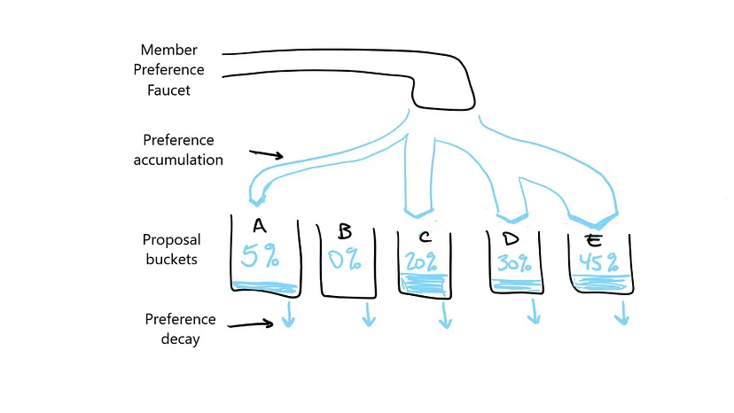 O voto por convicção difere de outros mecanismos de tomada de decisão porque não ordena as propostas de forma A vs B (como comparações de pares na Budget Box (caixa de orçamento) da Colony, por exemplo) — em vez disso, a comunidade considera todas as propostas indicadas a qualquer momento. Assim, uma pessoa poderia colocar metade de seu poder de voto na proposta A, um quarto na proposta B e dividir o quarto restante entre as propostas C e D. Você pode pensar em cada proposta como um balde e sua opinião ponderada por tokens, derramando suas preferências em propostas selecionadas nas proporções que você escolher.