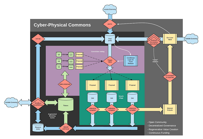 ######Um diagrama de um bem comum ciberfísico, construído a partir da biblioteca Commons Stack. O componente de Voto de Convicção do sistema é exibido em roxo, entre a Curva de Ligação Aumentada (preto) e o Mecanismo de Proposta Giveth (verde). Este diagrama é explorado mais adiante neste vídeo.