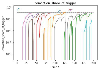 ######Um protótipo de exibição de voto por convicção inicial, demonstrando o crescimento e a decadência da convicção agregada para uma proposta de vários membros de uma comunidade.