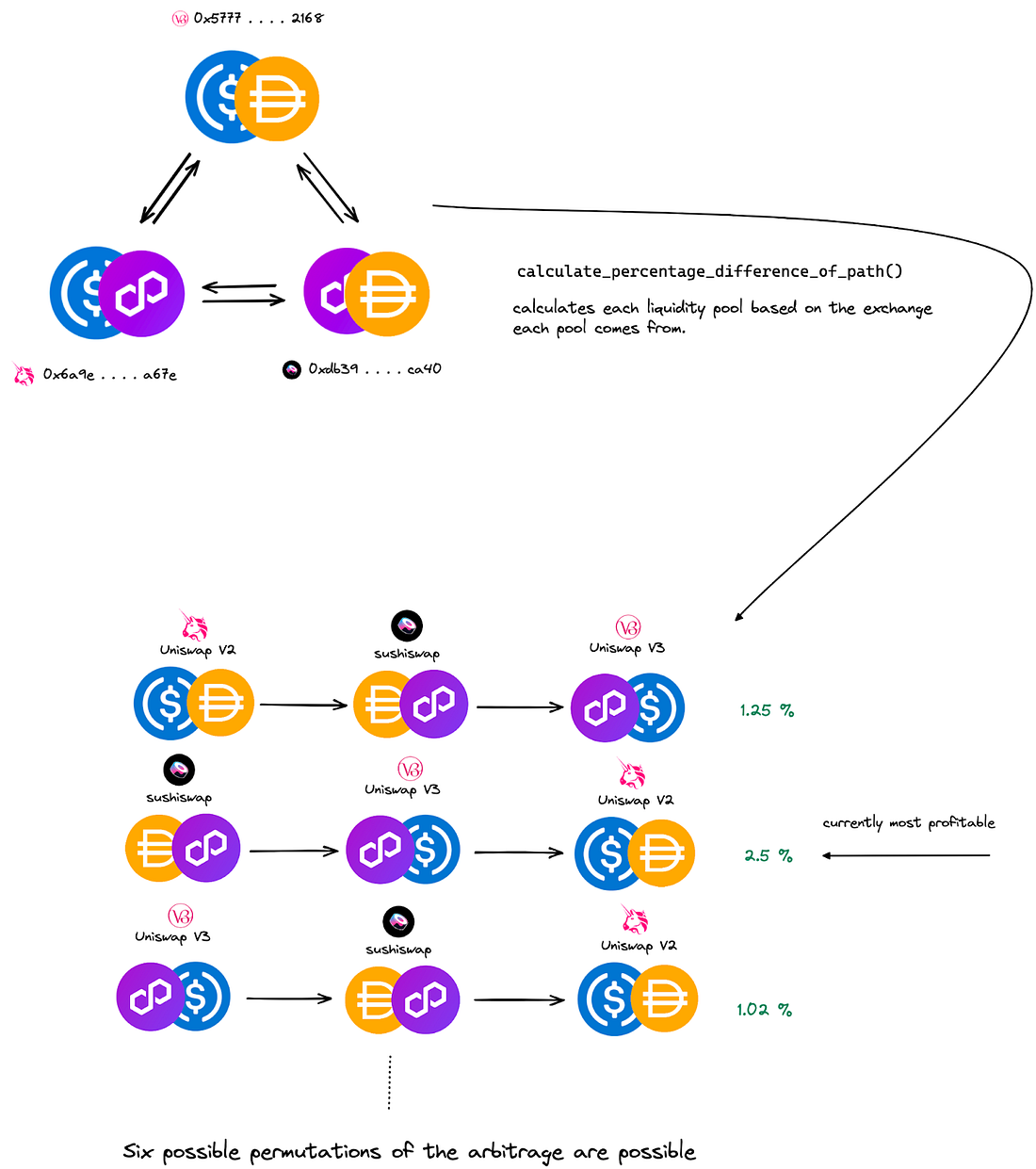 check_all_structured_paths() — itera sobre nosso array de objetos mapeados e passa cada caminho para find_most_profitable_permutation(). Esta função calcula a diferença percentual de preço mais rentável para o caminho dado. Se a PPD exceder nosso limite especificado, adicionamos o caminho à nossa lista de candidatos em potencial.